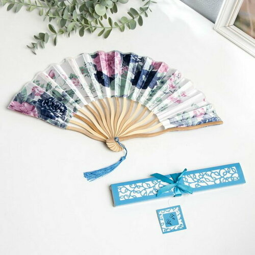Веер бамбук, текстиль h=21 см изгиб, с кистью "Цветы" в коробке, голубой