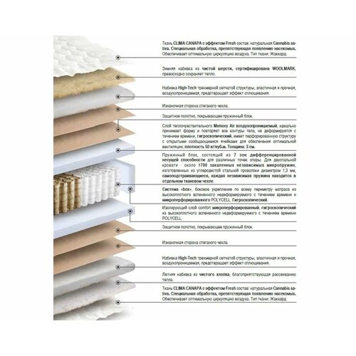 Высота 24 см. Уровень жесткости выше среднего. Материал с эффектом памяти Memory Air 3 см, плотный белый изолирующий слой из чёсанных термопрессованных волокон, 7-ми зональный независимый пружинный блок " ТФК" (TFK) 270 пр./кв. м, плотный белый изолирующий слой из чёсанных термопрессованных волокон, пенополиуретан Polycell. Съемный чехол из хлопкового жаккарда, зимняя сторона простегана на натуральной шерсти PURA LANA, летняя сторона - простегана на хлопке. Максимальный вес на 1 спальное место 140 кг.