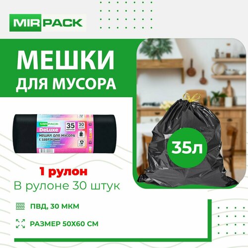 DELUXE с завязками 35 литров, 30 штук, ПВД, 30 мкм, размер 50*60 см, черные,1 рулон