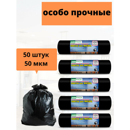 Мешки для мусора 120 л Extra черные (ПНД, 50 мкм, в рулоне 10 шт, 70x110 см). Комплект 5 рулонов