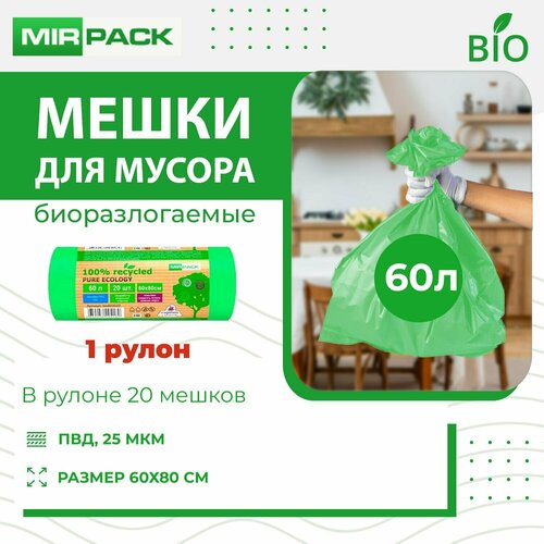 PURE ECOLOGY биоразлагаемые 60 литров, в рулоне 20 штук, ПВД, 25 мкм, размер 60х80 см, зеленые, 1рулон