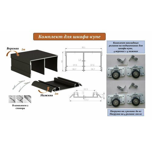 Комплект для шкафа-купе: накладные ролики на подшипниках (100кг) (ЛДСП 16-19мм) (4 верхних/ 4 нижних) + направляющая верхняя 1м + направляющая нижняя 1м + 2 стопора