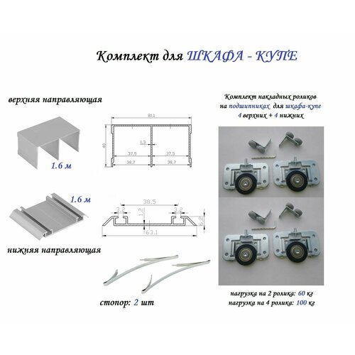 Комплект для шкафа-купе: накладные ролики на подшипниках (100кг) (ЛДСП 16-19мм) (4 верхних/ 4 нижних) + направляющая верхняя 1.6м + направляющая нижняя 1.6м + 2 стопора