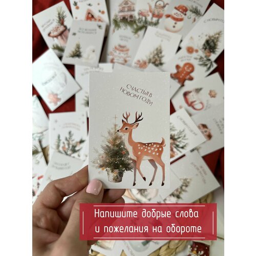Новогодние открытки мини Олени на подарки на Новый год 2025, набор 20 шт
