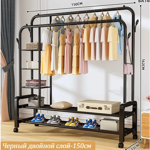 Вешалка для одежды и обуви, напольная металлическая, стеллаж с полками, 60 см, черная