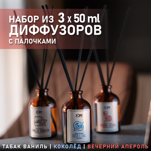 Набор ароматических диффузоров для дома "Вечерний апероль", "Коколёд","Табак-ваниль", HEDONISME, 3 x 50 мл