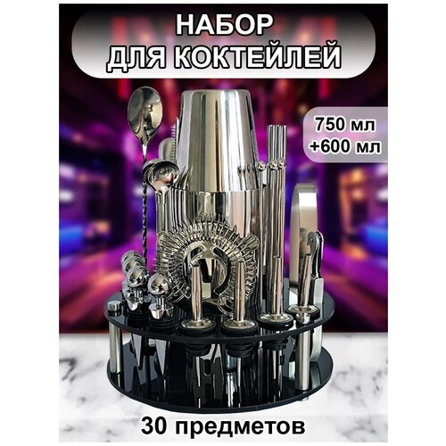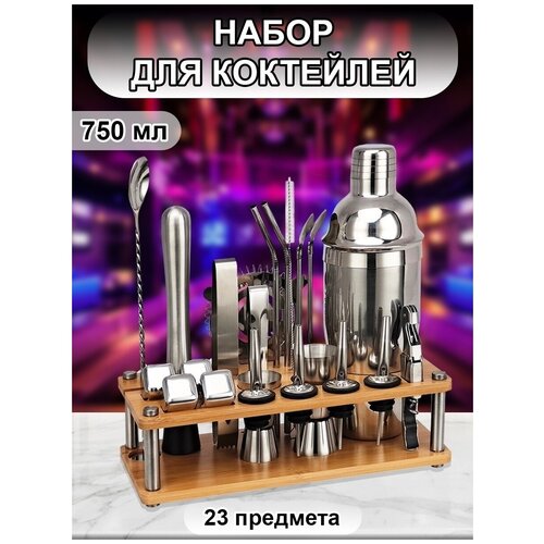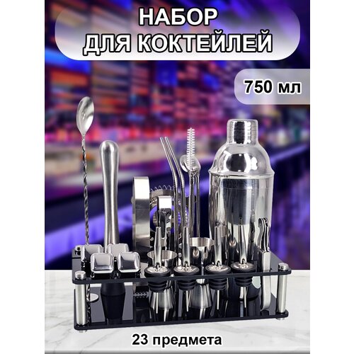 серебристый, хромНабор бармена включает в себя все необходимое для смешивания напитков и создания коктейлей. Набор состоит из 23 инструментов, изготовленных из качественной, нержавеющей стали: Барный Шейкер - Бостон - два стакана 750 + 600 мл или Коблер 750 мл. на ваш выбор - для взбалтывания и смешивания напитков; Стрейнер - для фильтрации крупных частиц коктейля; Джиггер - 2 шт. мерный стаканчик для сохранения правильной пропорции ингредиентов; Гейзер - 2 шт. для равномерного разлива напитков; Мадлер для выжимания сока из ягод и фруктов; Ложка Бармена с "пяткой" для слоистых коктейлей; Трубочки - 2 шт; Ложки - 2шт. для перемешивания; Ёршик для чистки трубочек; Щипцы для льда; Шпажки для фруктов - 4 шт; Мультитул - функциональный штопор открывалка; Пробки для бутылок - 2 шт. Ситечко для отсеивания мелких частиц коктейля; Подставка для хранения набора, изготовленная из бамбука. Стильный универсальный набор для приготовления коктейлей станет лучшим подарком мужчине, коллеге или другу.