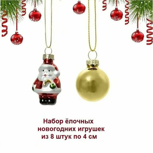Набор: 8 шт. елочная игрушка, Дед мороз и шарики золотые, стекло, 4 см