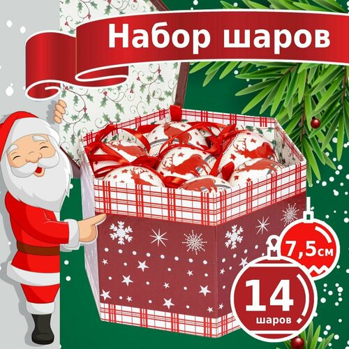 Новогодние игрушки - пластиковые елочные шары Winter Glade 7,5 см 7514G189, набор 14 шт, бело-красный микс
