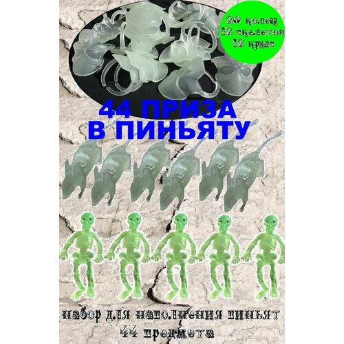 Набор 44 предмета для наполнения пиньят: Кольцо Череп 20 шт, Крыса 12 шт, Скелет 12 шт