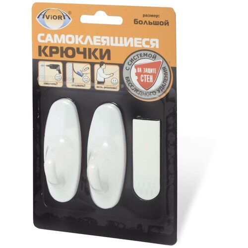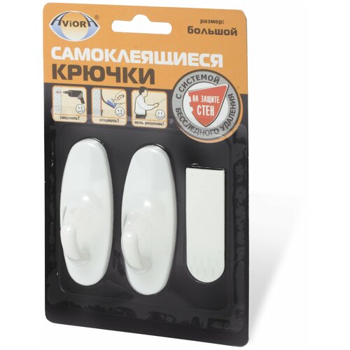 Крючки самоклеящиеся AVIORA, комплект 2 крючка 3 самоклеящиеся полоски, белые, большие, до 2,5 кг, 302-101