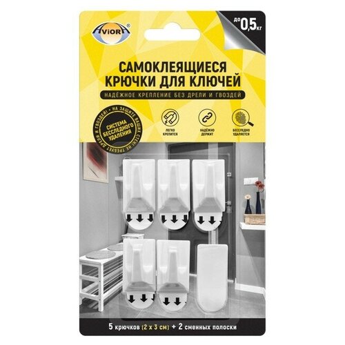 Самоклеящиеся крючки Aviora для ключей с системой бесследного удаления 2*3 см, 5 шт