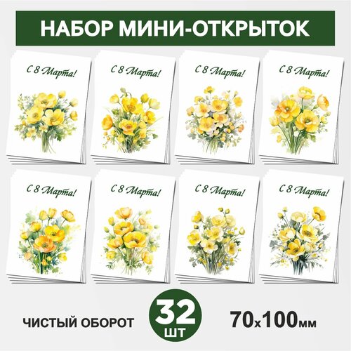 Набор мини-открыток 32 шт, 70х100мм, бирки, карточки, открытки для подарков на Международный Женский День, 8 Марта - №9, postcard_32_march_8_set_9