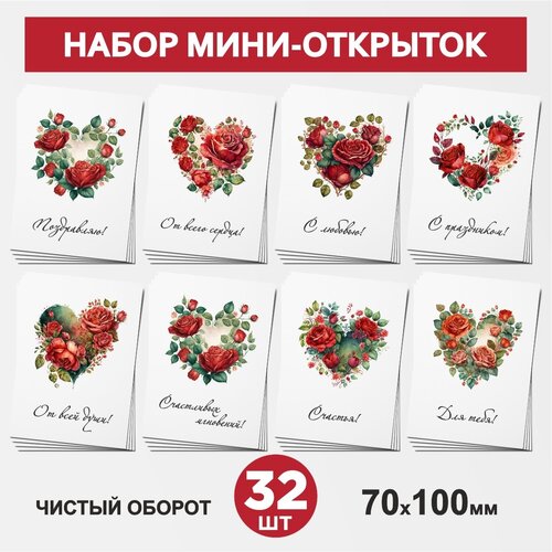 Набор мини-открыток 32 шт, 70х100мм, бирки, карточки, открытки для подарков на День Рождения - Сердце, цветы №3, postcard_32_heart_set_3