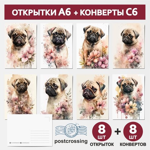 Набор почтовых открыток посткроссинг: открытки А6 - 8 шт, крафт-конверт С6 - 8 шт, postcrossing / Собака - №4 / postcard_8_postcrossing_dog_A6_set_4