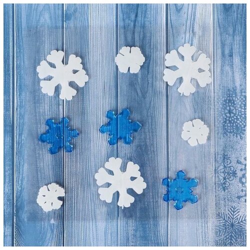 Наклейка на стекло "Снежинки белые и синие" (набор 9 шт) 12,5х12,5 см, сине-белый