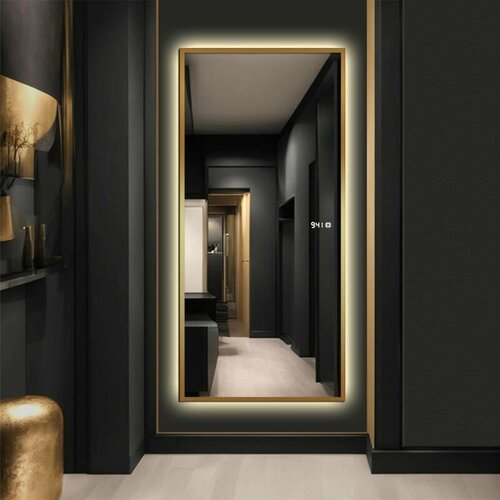 Зеркало настенное в полный рост Alias Квартал 160*60 в золотой алюминиевой раме с тёплой LED-подсветкой и часами