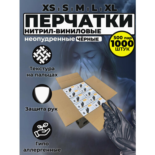 Нитриловые/Виниловые перчатки - Wally plastic, 1000 шт. (500 пар), одноразовые, неопудренные, текстурированные - Цвет: Чёрный; Размер XS