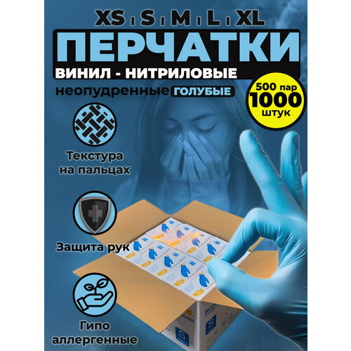 Нитриловые/Виниловые перчатки - Wally plastic, 1000 шт. (500 пар), одноразовые, неопудренные, текстурированные - Цвет: Голубой; Размер XL