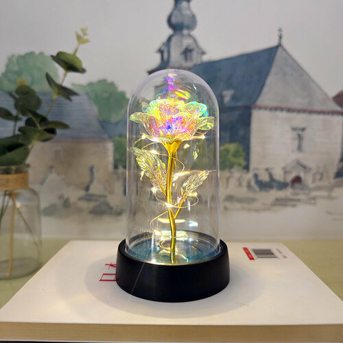 Сувенир на новый год искусственная роза в колбе из Красавицы и чудовища с подсветкой, темная подставка