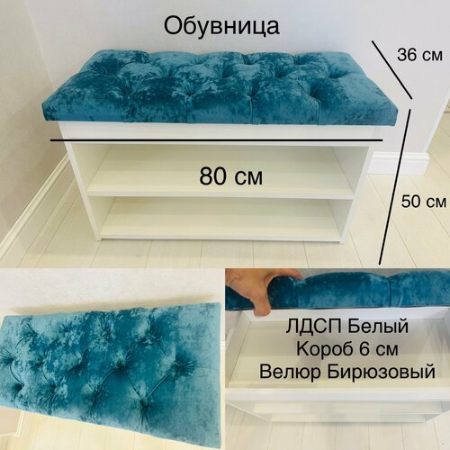 белый, серыйОбувница белая для прихожей с мягким сиденьем, каретная стяжка. Удобное и красивое решение для вашего дома и квартиры. Велюр впишется в любой интерьер, высокая износостойкость и простота ухода. Легко чистится пылесосом или влажной губкой. Размеры обувницы: длина - 80 см; глубина - 36 см; высота - 50 см . Обувница - банкетка имеет две полки для обуви, высота 16,5 см , 17.5 см, вмещает 8 пар обуви. Дополнительное отделение под крышкой - короб высотой 6 см, обеспечит удобное хранение обувных аксессуаров и принадлежностей.