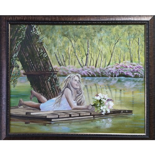 Картина маслом на холсте, ручная работа, пейзаж "Девочка на плоту", 2018 г, 54*65 см. Соснина Татьяна, магазин Три сосны.