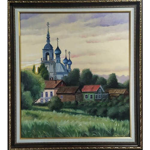 Летний пейзаж"Деревенский пейзаж с церковью", картина маслдом на холсте 57*54 см, ручная работа, Соснина Татьяна, магазин Три сосны.