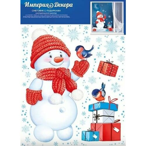 Новогодние наклейки на окно "Снеговик с подарками", двусторонние, размер листа 23,7х33,2 см