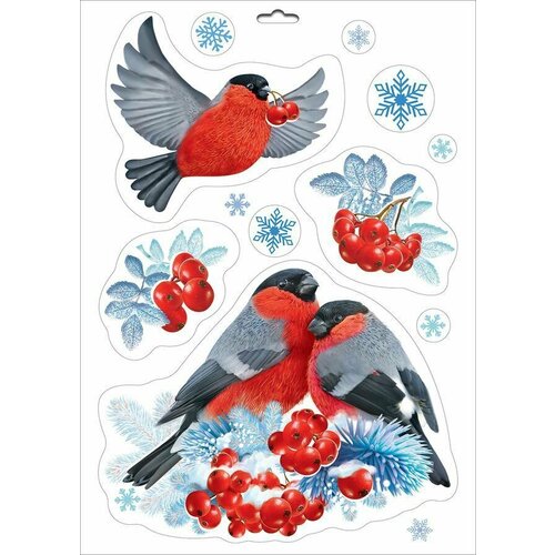 Новогодние наклейки "Снегири и рябина" двусторонние, размер листа 33,2х47 см