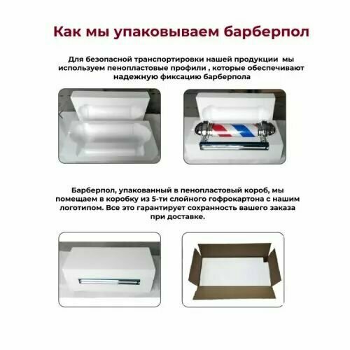 Барбер Пол (Barber's Pole) является неотъемлемым атрибутом любого барбер шопа. Фонарь (знак барбершопа) с узнаваемым вращающимся триколором - символ брадобрейского мастерства по всему миру. Устанавливается на улице или в помещении. Этот знак для клиентов -ориентир в выборе салона. Он означает, что здесь уважают традиции, чистое профессиональное бритьё и идеальную стрижку. Он делает парикмахерскую для мужчин более выделяющейся на фоне других салонов красоты. Барбер Пол выполнен из прозрачного пластика, но огромным преимуществом является яркая LED подсветка, барбер пол будет виден из далека. Надежный механизм вращения пола обеспечит долгую его работу. А гальваническое хромированное покрытие обеспечит надежную защиту от внешних воздействий окружающей среды. Полная высота: 52 см. Глубина: 26 см. Диаметр: 21 см. Высота цилиндра: 27,5 см. Диаметр цилиндра: 20 см. Длинна и ширина стойки крепления: 39 х 6 см. Мощность: 12 Ватт. Cетевой шнур имеет двойной выключатель, один отвечает за вкл/выкл вращение внутреннего