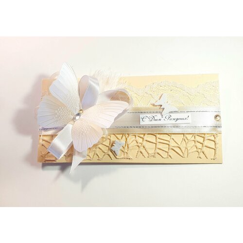 Авторский конверт для денег "С днем рождения!" бежевый, бабочка. Ручная работа.