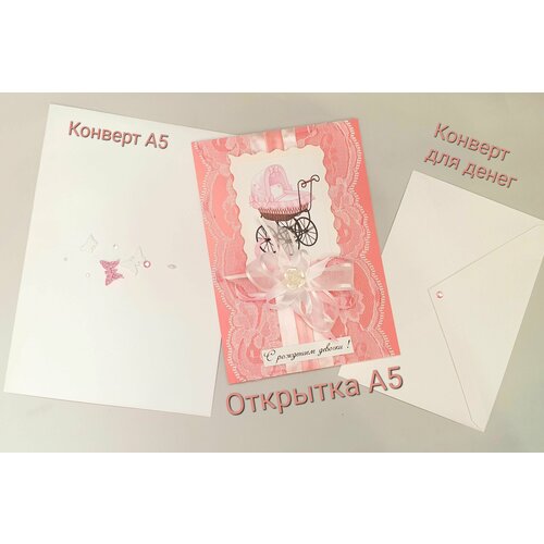 Открытка ручной работы "С рождением девочки!", с новорожденной, рождение дочки, А5 + Конверт и конверт для денег