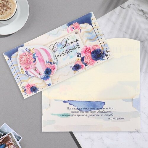 Стильная открытка Конверт для денег "С Днём Рождения!" глиттер, дек. элемент, воздушный шар, 9х17 см