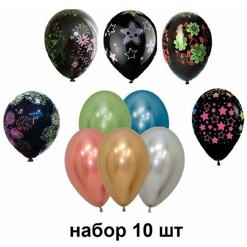Шар воздушный черный с цветным неоновым рисунком и супер металлик 30 см/12" набор 10 шт