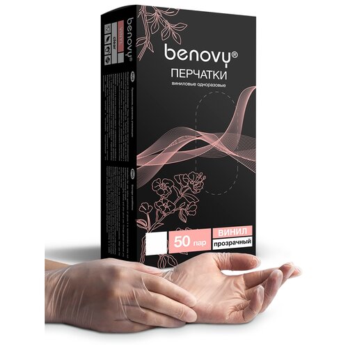 Перчатки Benovy виниловые одноразовые, 50 пар, размер L, цвет прозрачный