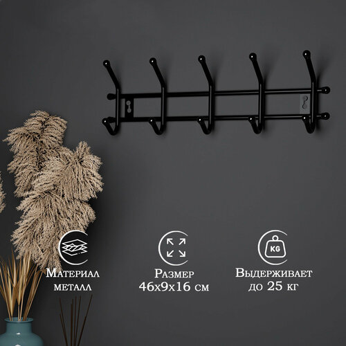 Вешалка настенная для одежды в прихожую, гардеробную на 5 двойных крючков "Уют 5", цвет чёрный, размер 46х16х9 см
