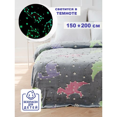 Плед светящийся в темноте Павлина Динозавры цветные (светонакопитель), 150х200, 1,5-спальный
