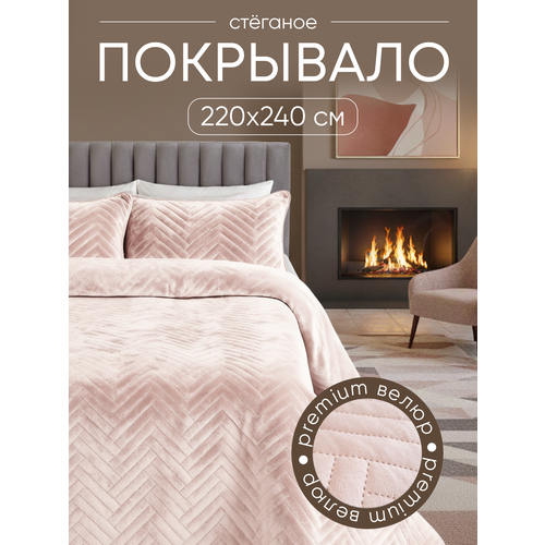 Покрывало на кровать 220х240, Tessolo Home, стеганое велюровое, бархатистое , "Ёлочки" персик