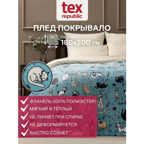 Плед TexRepublic Absolute 180х200 см, 2 спальный, фланелевый, покрывало на диван, теплый, мягкий, ментоловый с принтом коты