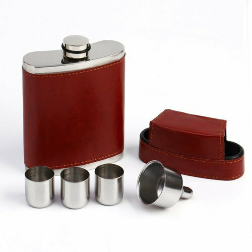 Подарки Фляжка с тремя стопками и воронкой в коричневой оплетке (240 мл)
