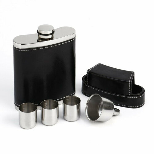Подарки Фляжка с тремя стопками и воронкой в черной оплетке (240 мл)