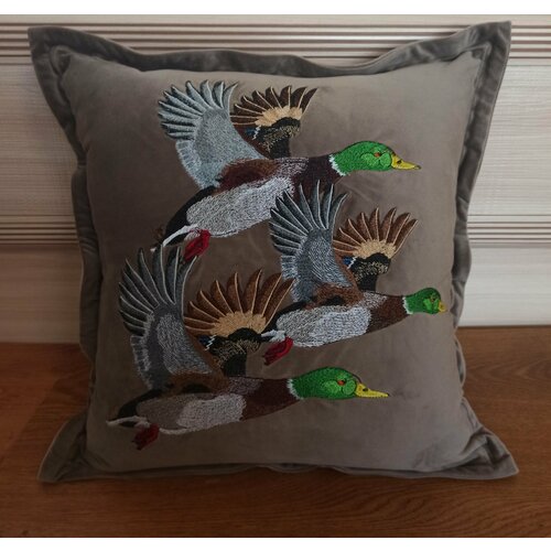 Подушка декоративная из бархата с вышивкой. "Подарок охотнику - утки", 45x45.