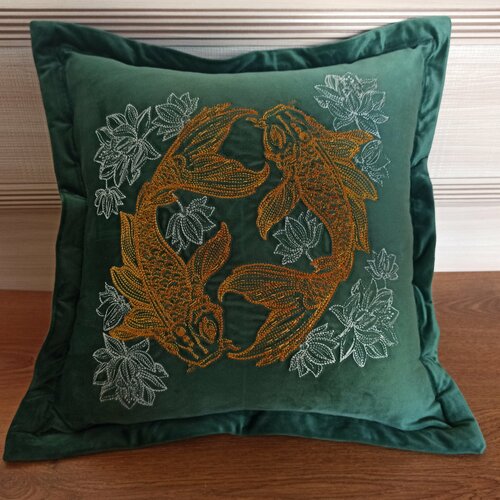 Дизайнерская, декоративная подушка, съемная наволочка с машинной вышивкой из бархата 45х45. Рыбы