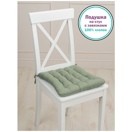Подушка на стул с завязками Bio-Line/Декоративная подушка/Сидушка на стул/Табуретник/Хлопок/35х37 см/ олива