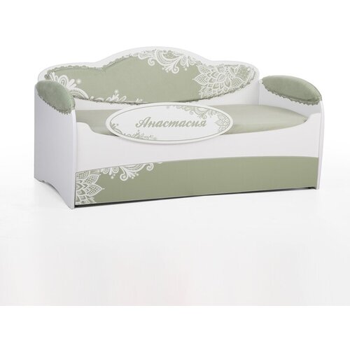 Детская диван-кровать MIA, цвет олива, с ящиком для белья, мягкими подлокотниками и бортиком-ограничителем, 160х80см.