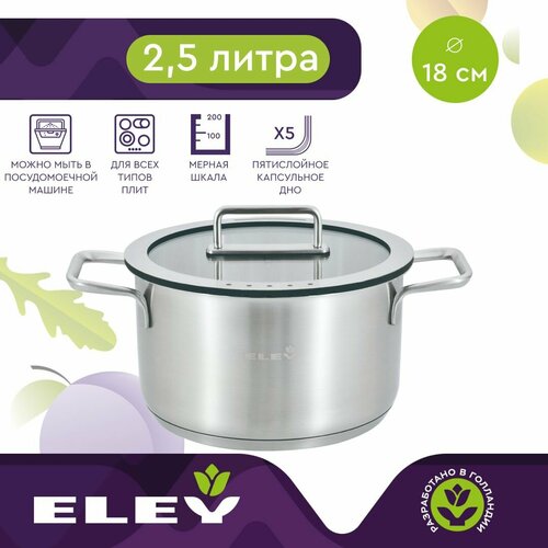 Кастрюля с крышкой с силиконовыми вставками 2,5л 18 см ELEY с металлической крышкой и металлическими ручками