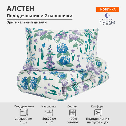 Постельное белье 2 спальное "Алстен", пододеяльник 200х200, наволочки 50x70 (2 шт) белый/цветочный узор