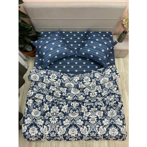 Постельное белье 2 спальное с евро простыней Перкаль синий, белый