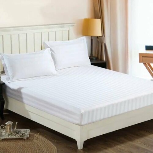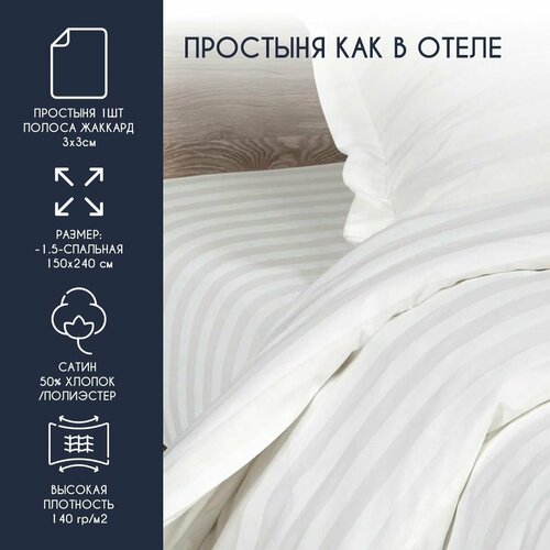 Простыня HORECA полутороспальная 150*240 (Страйп 3:3) сатин люкс хлопок 50%, пэ 50% / отельная/ белая, полосатая, отеля, гостиницы, дома