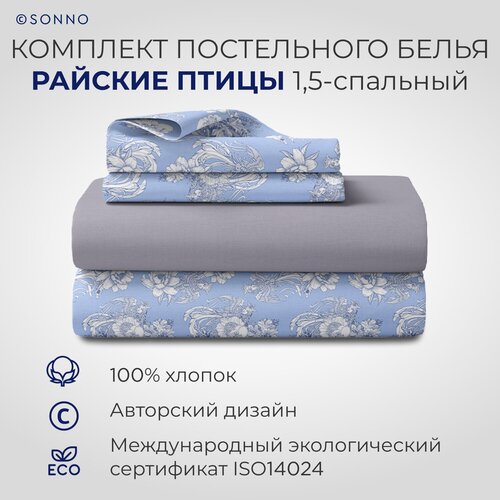 Комплект постельного белья SONNO Райские Птицы, 1.5-спальное, поплин, птицы ночь/платина